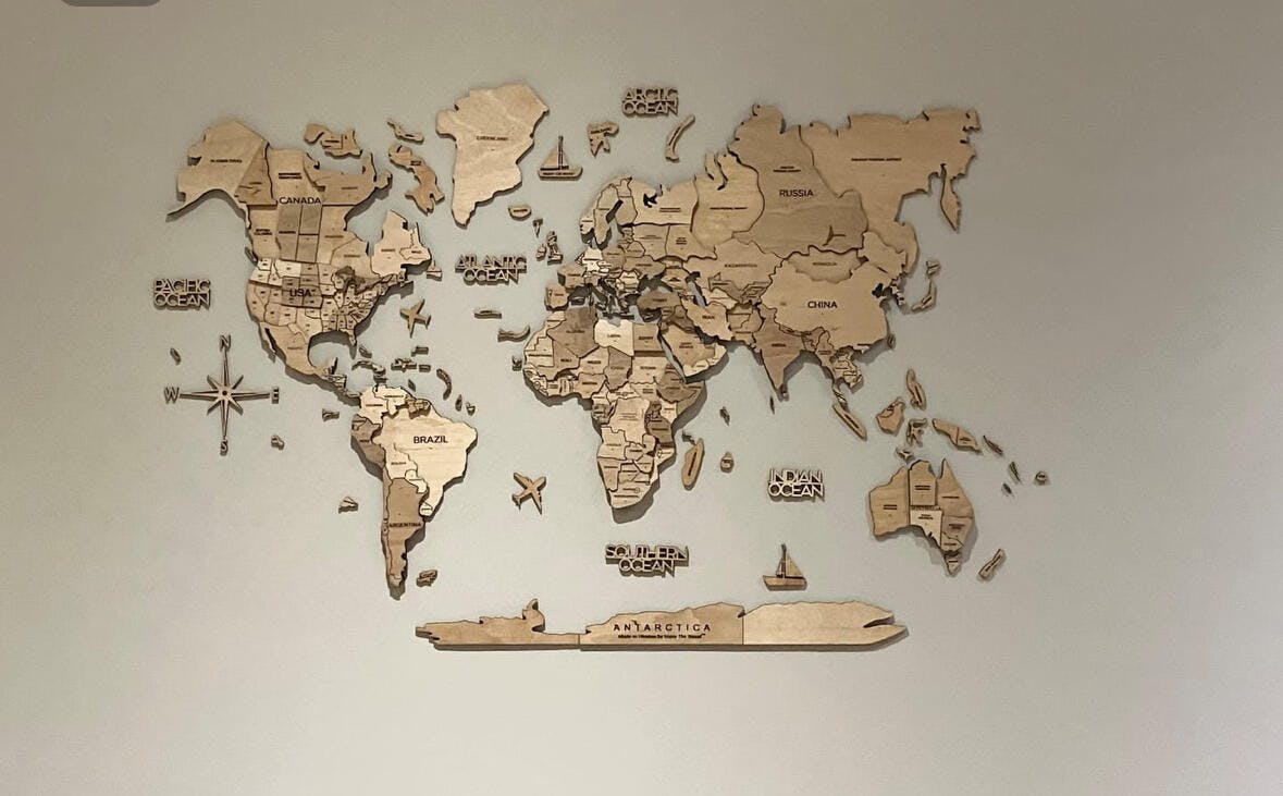 Bemærk: Verdenskortet er et flot stykke kunst skåret i egetræ. Af praktiske grunde kan alle øer ikke vises, da disse er for små og ikke kan udskæres. Således kan det heller ikke bruges til skolebrug m.v.